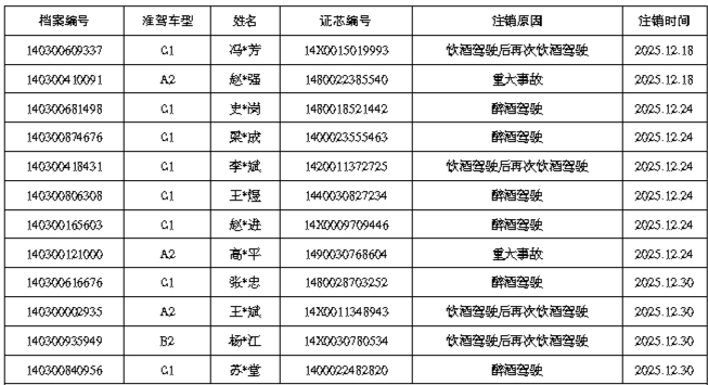 根據(jù)《機動車駕駛證申領(lǐng)和使用規(guī)定》(公安部162號令)第七十九條第一款第六項之規(guī)定,現(xiàn)公布以下機動車駕駛?cè)笋{駛證被注銷。
